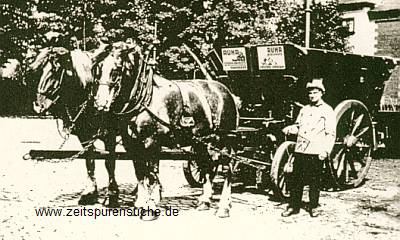 Wenn Händler, Handwerker oder Gewerbetreibende, Bäcker oder Bauern etwas auszuliefern hatte, bedienten sie sich zweckmäßigerweise des Pferdewagens: Mal war es der eigene Geschäftswagen, mal ein Mietfuhrwerk, mal werbewirksam ausgestattet, mal ein Provisorium. Hier sind ein paar bildliche Beispiele aus der Zeit, als das Pferd der "Motor" beim Gütertransport auf der Straße und ein ganz alltäglilcher Anblick war, sei es beim Transport von Baumaterial über weite Strecken oder bei der Lieferung von Milch und Backwaren von Haus zu Haus innerhalb der Ortschaften. |