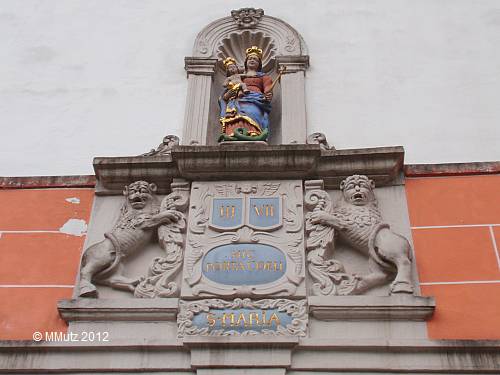 Mai 2012 Diese Bekrönung des Portals von St. Pankratius zierte einmal das Hauptportal der "Neuen Prälatur" des Klosters Altenberg. Auf einem Kupferstich von Johann Jakob Sartor aus dem Jahr 1707 kann man es erkennen. |