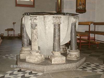 Mai 2012 Taufstein in St. Pankratius aus dem 12. oder 13. Jh.: ein achtseitiger Kessel, getragen von acht frei stehenden, im Schaft schwarz gefassten Säulchen, aber ohne die in jener Zeit recht beliebten |
