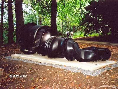 | Schon an den Serpentinen der Auffahrt zum eigentlichen Park sind die ersten "typisch organischen" Plastiken zu sehen, je nach Tageszeit und Belaubungszustand der Umgebung in geheimnisvolles Halbdunkel getaucht oder wie ein bizarr-filigraner Scherenschnitt in den mehr oder weniger bergisch-blauen Himmel ragend. |